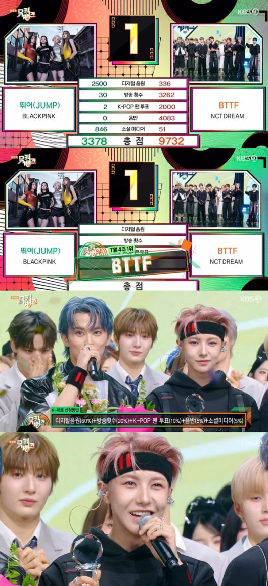 25일 방송된 KBS2 음악방송 '뮤직뱅크'에서는 블랙핑크의 '뛰어' NCT드림의 'BTTF'가 1위 후보로 격돌했다.