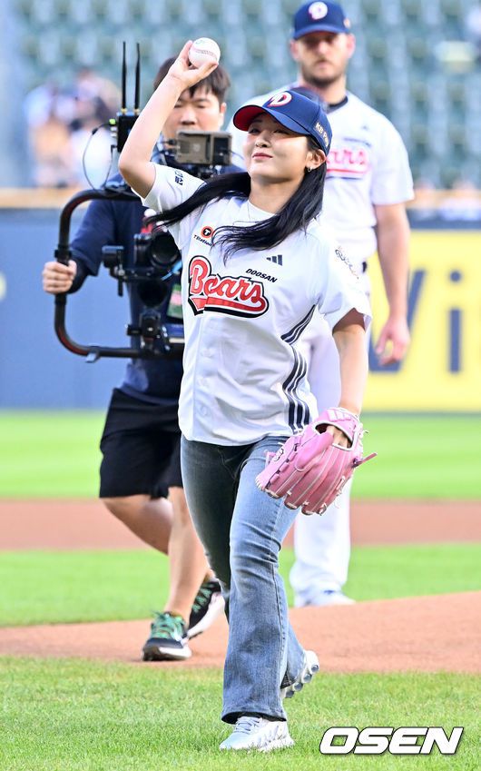 [OSEN=잠실, 민경훈 기자] 25일 오후 서울 잠실야구장에서 2025 신한 SOL Bank KBO리그 두산 베어스와 LG 트윈스의 경기가 열렸다. 이날 두산은 콜어빈, LG는 에르난데스를 선발로 내세웠다. 경기 전 이예원 프로가 시구를 하고 있다. 2025.07.25 / rumi@osen.co.kr