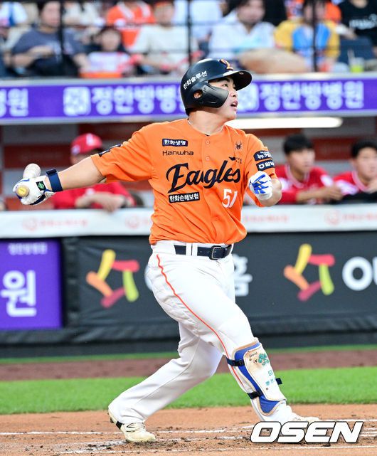[OSEN=대전, 최규한 기자] 25일 대전 한화생명볼파크에서 ‘2025 신한 SOL Bank KBO리그’ 한화 이글스와 SSG 랜더스의 경기가 열렸다. 홈팀 한화는 라이언 와이스, 방문팀 SSG는 드류 앤더슨을 선발로 내세웠다. 1회말 1사 3루 상황 한화 문현빈이 선제 1타점 적시타를 날리고 있다. 2025.07.25 / dreamer@osen.co.kr