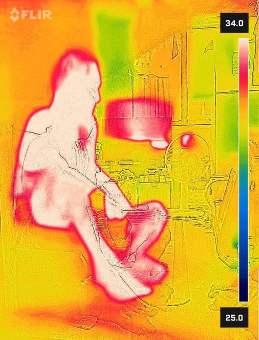 24일 서울역 쪽방촌에서 한 주민이 에어컨이 없는 방에서 더위를 견디고 있다. 열화상 카메라 촬영. 온도가 높은 곳은 붉게, 낮은 곳은 푸르게 표시돼 있다. 2025.7.24 연합뉴스 |