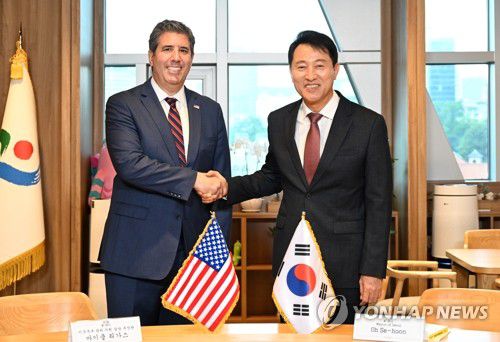 (서울=연합뉴스) 오세훈 서울시장이 25일 서울 중구 시청 집무실에서 마이클 리가스 미국 국무부 관리·자원 담당 부장관과 면담을 마친 후 기념 촬영하고 있다. 2025.7.25 [서울시 제공. 재판매 및 DB 금지]