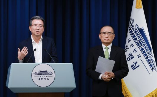 김용범 대통령실 정책실장(왼쪽)과 위성락 국가안보실장이 25일 서울 용산 대통령실 청사에서 이날 강훈식 대통령비서실장 주재로 열린 통상대책회의 관련 브리핑을 하고 있다. 연합뉴스 |
