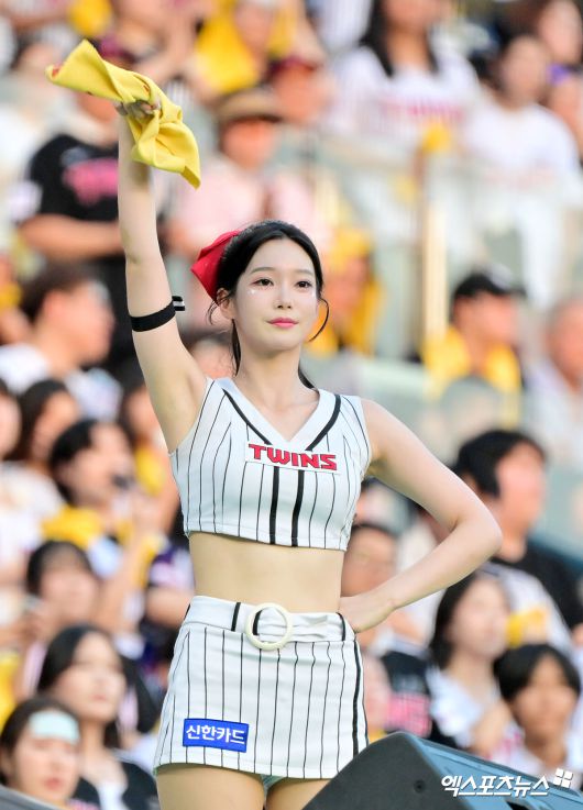 (엑스포츠뉴스 잠실, 김한준 기자) 25일 오후 서울 송파구 잠실야구장에서 열린 '2025 신한 SOL Bank KBO리그' LG 트윈스와 두산 베어스의 경기, 계유진 치어리더가 열띤 응원을 선보이고 있다.