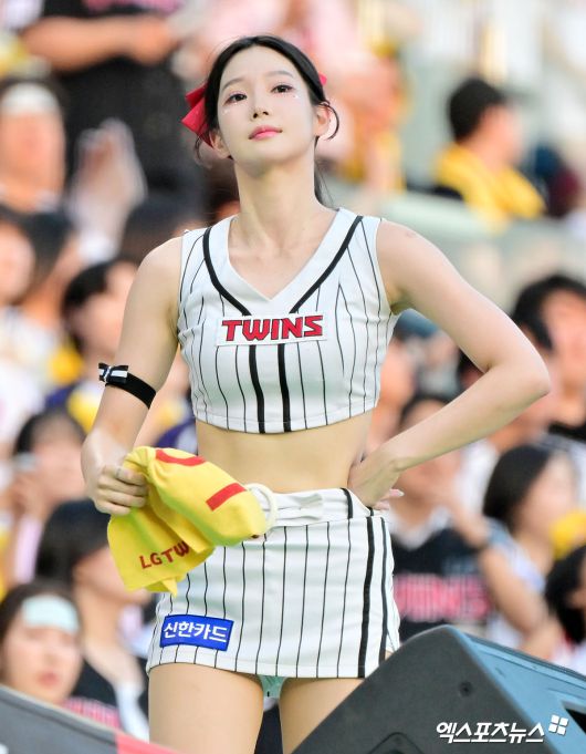(엑스포츠뉴스 잠실, 김한준 기자) 25일 오후 서울 송파구 잠실야구장에서 열린 '2025 신한 SOL Bank KBO리그' LG 트윈스와 두산 베어스의 경기, 계유진 치어리더가 열띤 응원을 선보이고 있다.김한준 기자 kowel@xportsnews.com