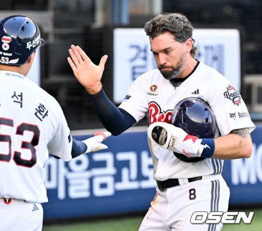 [OSEN=잠실, 민경훈 기자] 25일 오후 서울 잠실야구장에서 2025 신한 SOL Bank KBO리그 두산 베어스와 LG 트윈스의 경기가 열렸다. 이날 두산은 콜어빈, LG는 에르난데스를 선발로 내세웠다. 1회말 1사 주자 1,3루 두산 박준순의 좌익수 왼쪽 1타점 적시타때 홈을 밟은 케이브가 덕아웃 앞에서 양석환과 하이파이브를 하고 있다. 2025.07.25 / rumi@osen.co.kr