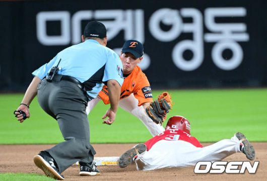 [OSEN=대전, 최규한 기자] 25일 대전 한화생명볼파크에서 ‘2025 신한 SOL Bank KBO리그’ 한화 이글스와 SSG 랜더스의 경기가 열렸다. 홈팀 한화는 라이언 와이스, 방문팀 SSG는 드류 앤더슨을 선발로 내세웠다. 6회초 무사 1루 상황 SSG 석정우 타석 때 주자 정준재가 2루 도루에 성공하고 있다. 2025.07.25 / dreamer@osen.co.kr