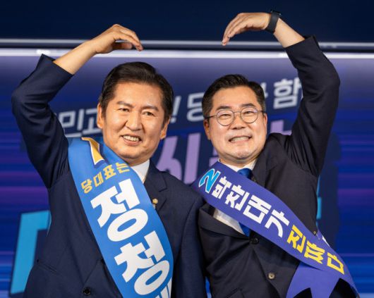 더불어민주당 대표 선거에 출마한 정청래(왼쪽), 박찬대 후보가 19일 서울 여의도 당사에서 열린 합동연설회에서 함께 손하트를 만들고 있다. (사진=더불어민주당) |