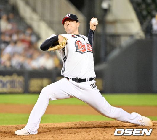 [OSEN=잠실, 민경훈 기자] 25일 오후 서울 잠실야구장에서 2025 신한 SOL Bank KBO리그 두산 베어스와 LG 트윈스의 경기가 열렸다. 이날 두산은 콜어빈, LG는 에르난데스를 선발로 내세웠다. 8회초 마운드에 오른 두산 고효준이 힘차게 공을 뿌리고 있다. 2025.07.25 / rumi@osen.co.kr