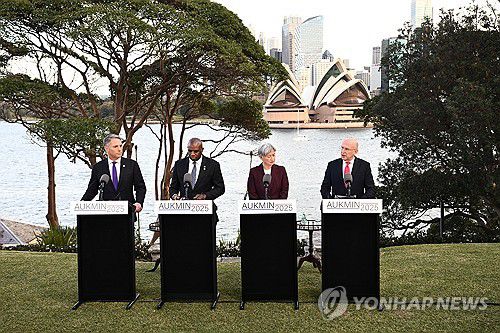 25일 시드니에서 기자회견 하는 영국·호주 국방·외무장관들 |