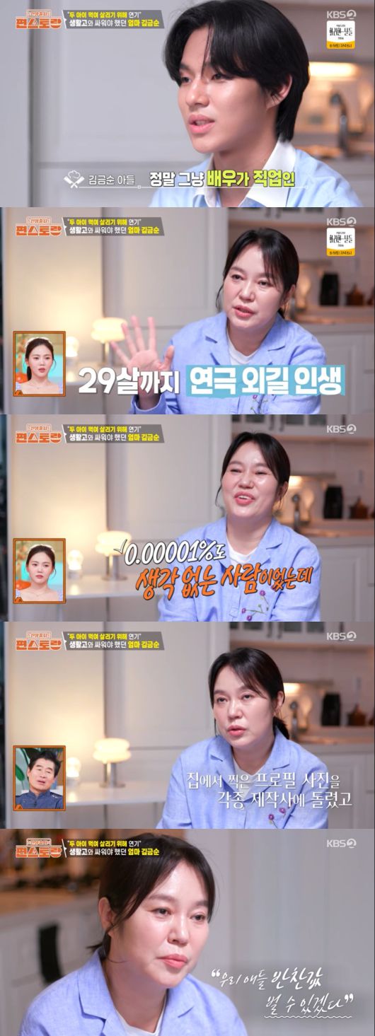 김금순의 첫째 아들은 "(어머니는) 스타가 되는 게 꿈이 아니라 정말 그냥 배우가 직업인. '어떻게 이 아이 둘을 먹여 살릴까'(이 생각 뿐이었다)"라고 말했다.