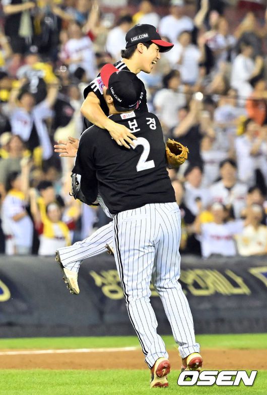 경기를 마치고 LG 구본혁과 문보경이 승리의 기쁨을 나누고 있다. 2025.07.25 / rumi@osen.co.kr