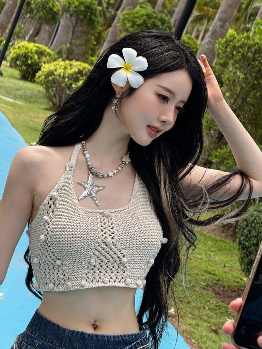 머리를 한쪽으로 넘겨 꽃을 꽂은 모습은 자연스러우면서도 스타일리시하다. 그의 홀터넥 크로셰 톱과 구슬 장식 네크리스는 여름의 계절과 조화를 이루며 밝은 햇빛 아래에서 더욱 빛나는 그녀의 미모를 강조한다.