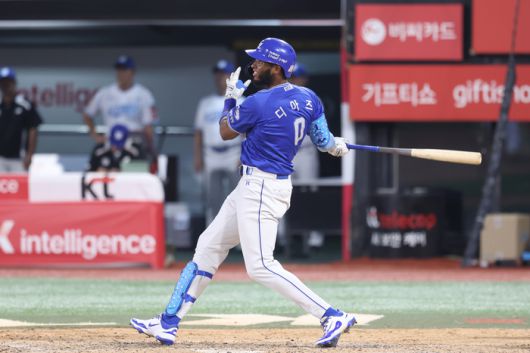 삼성 디아즈가 25일 수원케이티위즈파크에서 열린 2025 KBO리그 KT전에서 9회초 솔로포를 때리고 있다. 사진 | 삼성 라이온즈 |