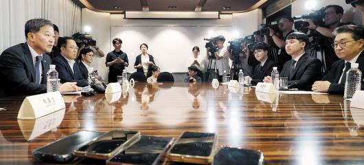 25일 오전 서울 중구 한 호텔에서 전공의들의 병원 복귀 방안을 논의하는 수련협의체 1차 회의가 열렸다. 이형훈(맨 왼쪽) 보건복지부 2차관, 김원섭(맨 오른쪽) 대한수련병원협의회장, 한성존(오른쪽에서 둘째) 대한전공의협의회 비대위원장 등이 참석했다. /김지호 기자 |