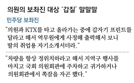 의원의 의정 활동과 개인 활동의 경계가 뚜렷하지 않은 만큼 어느 순간 공사(公私) 구분도 희미해지기 일쑤다. 의원 배우자를 위한 수행 직원이 따로 있다는 이야기는 여야를 막론하고 공공연하게 퍼져 있다. 의원 배우자에게 밉보여 의원실을 그만두게 됐다는 이야기들도 심심찮게 들려온다. 한 보좌진 D 씨는 “예약이 어려운 고급 레스토랑도 의원 가족 기념일에 예약해야 하고, 명절에는 의원 가족의 KTX·SRT 좌석까지 특실로 예매해야 한다”며 “수행하다 보면 교통편이나 식비 지출이 많은데 경비 외에 초과된 지출을 의원이 보전해 주지 않는 경우도 많다”고 토로했다.