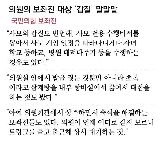 의원이 ‘밥줄’을 쥐고 있으니 갑질에도 취약할 수밖에 없다. 선임비서관 C 씨는 “다 먹고살자고 하는 일인데 식사 시간을 보장해 주지 않는 의원들도 많다”며 “본인은 식사하러 나가면서 업무를 지시하고 식사를 마친 즉시 결과물을 요구하는 경우가 허다하다”고 말했다.