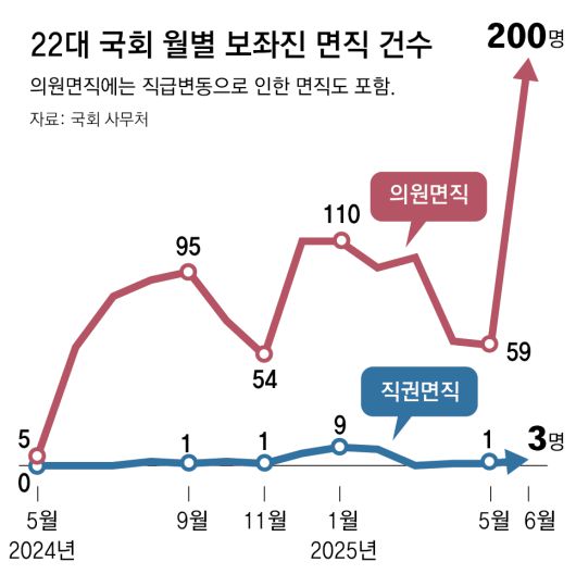 국회 사무처에 따르면 22대 국회가 출범한 지난해 5월 보좌진 의원면직은 5명에서 6월 58명, 7월 83명, 8월 91명, 9월 95명으로 순차적으로 늘어났다. 같은 기간 직권면직은 총 3명에 불과했는데, 실제 직급 변동으로 인한 면직을 제외하면 의원면직 통계의 상당 부분이 사실상 직권면직에 해당한다는 것이다.