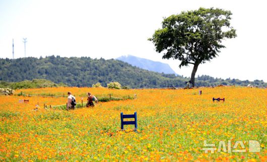 [서귀포=뉴시스] 우장호 기자 = 폭염이 기승을 부리는 25일 오후 서귀포시 안덕면 제주신화월드 신화가든에 황화코스모스가 활짝 피어나 이색정취를 자아내고 있다. 2025.07.25. woo1223@newsis.com |