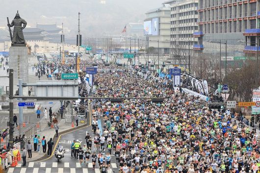 지난해 3월17일 서울 광화문광장에서 2024 서울마라톤에 참가한 선수들이 출발하고 있다. 연합뉴스 |