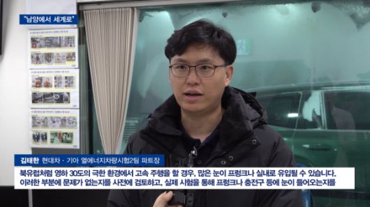 "북유럽처럼 영하 30도의 극한 환경에서 고속 주행을 할 경우, 많은 눈이 프렁크나 실내로 유입될 수 있습니다. 이러한 부분에 문제가 없는지를 사전에 검토하고, 실제 시험을 통해 프렁크나 충전구 등에 눈이 들어오는지를 확인하고 있습니다."