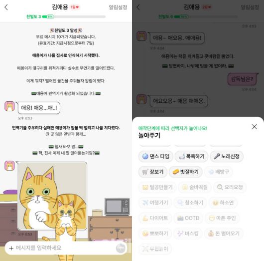챗봇의 핵심은 ‘친밀도’ 시스템이다. 대화를 꾸준히 이어가면 애용이의 태도가 달라진다. 처음엔 무심하게 고개만 돌리던 애용이가 어느 순간부터 ‘집사’라는 호칭을 쓰기 시작한다. 애착 2단계에 이르면 ‘애용어 번역기’가 열리고, 이제야 텍스트 기반 대화도 가능해진다.