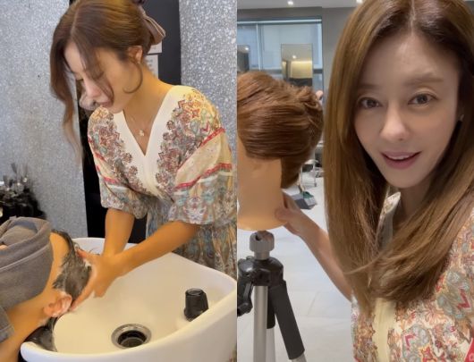 영상 속 이지현은 고객의 머리를 직접 감겨주는 모습이다. 또한 자신이 직접 만진 업스타일 머리를 보여줘 눈길을 끈다.