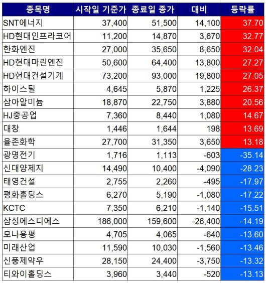 이밖에 HD현대마린엔진(27.27%), HD현대건설기계(27.05%), 하이스틸(26.37%), 삼아알미늄(20.56%), HJ중공업(14.67%), 대창(13.69%), 율촌화학(13.18%) 등이 크게 올랐다.