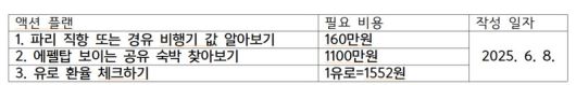 그렇다면 어떻게 목표를 정하면 좋을까요? 지금부터 이룰 수밖에 없는 나만의 목표 세우는 방법을 소개하겠습니다. 바로 목표에 시각화, 구체화, 수치화를 담는 것입니다. 예를 들어 ‘여행 가기’ 대신 ‘프랑스 파리 에펠탑이 보이는 공유 숙박에서 한 달 살기’라고 바꿔볼까요? 글만 읽었는데 머릿속에서 에펠탑과 샹젤리제 거리를 걷고 있는 모습이 떠올랐을 겁니다. 이를 동사형 목표라고 불러요. 이 방법대로 목표를 세운 다음 여기에 맞는 액션플랜을 만듭니다. ‘이렇게까지 해야 하나?’ 의구심이 들 수 있어요. 많은 사람이 목표는 정했는데 희망 사항으로 남는 이유가 구체적인 행동이 빠졌기 때문입니다. 매번 이루지 못한 채 흐지부지 사라졌다면 이번 기회에 새로운 방법으로 시도해 보세요. 목표 하나에 3가지 계획과 필요한 비용을 적습니다. 이루고 싶은 욕심이 커서 너무 많이 적으면 시작하기 전부터 지칠 수 있으니 주의하세요.