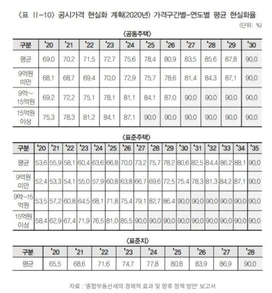 문 정부가 마련한 공시가격 현실화 로드맵은 유형별로 차이는 있지만 오는 2035년까지 현실화율을 90%까지 올리는 것이 골자이다. 당시 로드맵에 따르면 내년 현실화율은 공동주택 80.9%, 단독주택 70.0%, 토지 83.9% 등이다.