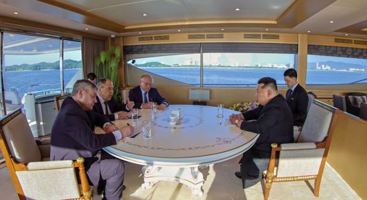 12일 방북 중인 세르게이 라브로프 러시아 외무장관과 요트에서 회담하고 있는 김정은. 요트 창밖으로 원산 시내와 새로 지은 갈마해안관광지구가 병풍처럼 펼쳐졌다. 노동신문 뉴스1 |