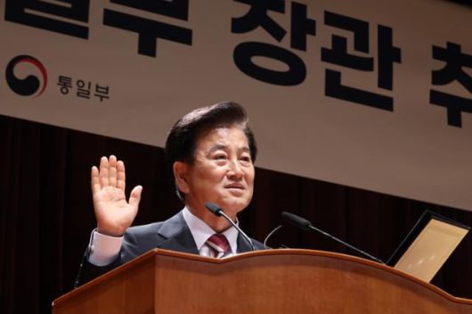 정동영 통일부 장관이 25일 서울 종로구 정부서울청사 별관에서 열린 제44대 통일부 장관 취임식에서 공무원 선서를 하고 있다. 뉴시스 |