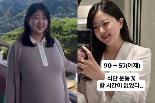 김다예는 25일 인스타그램에 "90㎏→57㎏(어제). 식단, 운동X. 할 시간이 없었다"고 남겼다. 사진 속 김다예는 살을 빼고, 출산 전 미모를 되찾은 모습이다.