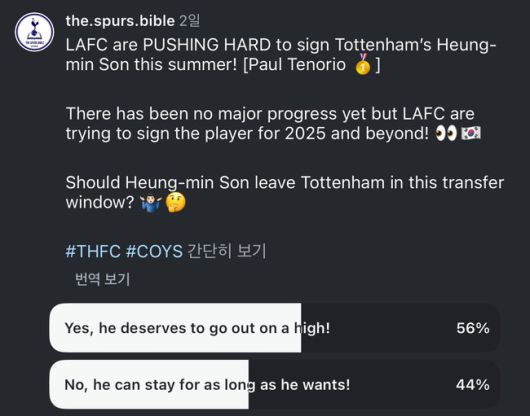그렇다면 이 소식을 접한 팬들의 반응은 어떨까? 토트넘 소식통인 '더 스퍼스 바이블'은 "이번 여름 손흥민은 토트넘과 작별해야 하나?"라며 투표를 진행했다. 결론부터 말하자면 여론은 둘로 나뉘었다. 찬성 비율은 56%였고, 잔류를 희망하는 쪽은 44%였다.