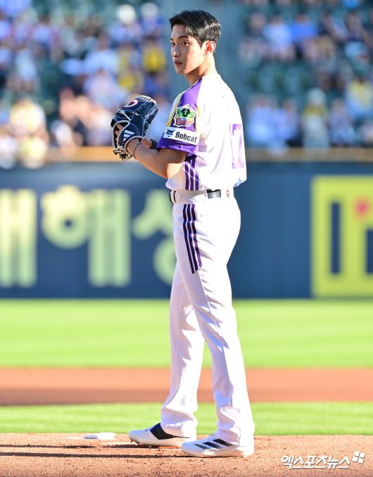 (엑스포츠뉴스 잠실, 김한준 기자) 26일 오후 서울 송파구 잠실야구장에서 열린 '2025 신한 SOL Bank KBO리그' LG 트윈스와 두산 베어스의 경기, 경기 전 세븐틴 도겸이 시구에 임하고 있다.