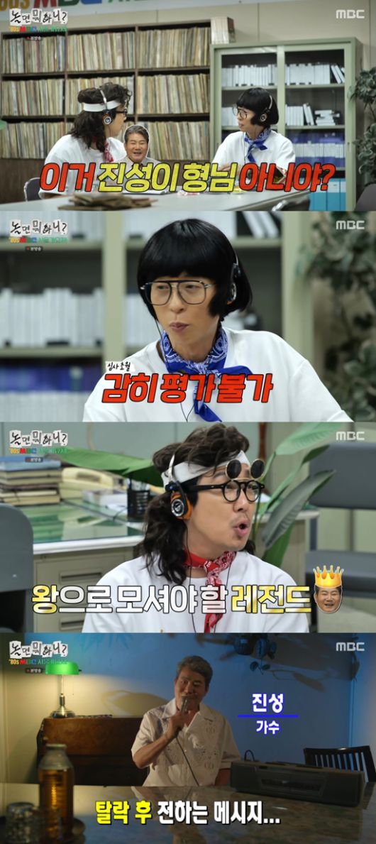 유재석도 "진성 형님을 어떻게 심사하냐. 사실 이분은 우리가 노래로 평가할 수 없다"라며 심사를 거부했다. 하하는 "선생님은 다른 특집의 왕으로 모셔야 한다"라며 존경심을 보였다.