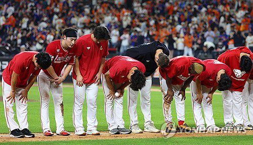 (대전=연합뉴스) 김도훈 기자 = 26일 대전 한화생명 볼파크에서 프로야구 2025 신한 SOL 뱅크 KBO리그 SSG 랜더스와 한화 이글스 경기가 끝난 뒤 김광현(왼쪽 네번째)과 선수들이 팬들에게 인사하고 있다. 이날 김광현은 6이닝 2실점하며 팀의 9-3 승리를 견인하며 류현진과의 첫 선발 맞대결에서 승리를 거두었다. 2025.7.26