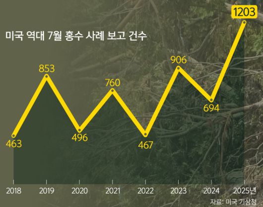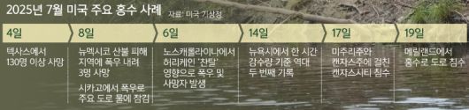2025년 7월, 미 전역이 ‘물폭탄’에 뒤덮였다. 7월4일부터 시작된 미국 독립기념일 연휴 기간 발생한 대홍수로 남부 텍사스주에서 최소 135명이 사망한 것을 시작으로 약 2주 동안 뉴멕시코(남서부), 일리노이(중부), 노스캐롤라이나(남동부), 메릴랜드(동부), 뉴욕(북동부) 등 거의 미 전역에서 동시다발적으로 급류성 홍수가 발생한 것이다. 불과 몇 시간만에 급작스럽게 내리는 비로 일리노이 시카고와 같은 대도시와 수도 워싱턴 인근 메릴랜드 몽고메리 카운티 등에서 도로가 물에 잠기고 사람들이 자동차를 물에 잠긴 도로 한가운데 버리고 나오는 모습도 심심찮게 눈에 띄었다.