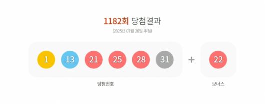 26일 1182회 로또 1등 당첨 번호는 '1·13·21·25·28·31'로 결정됐다. 보너스 번호는 '22'다.