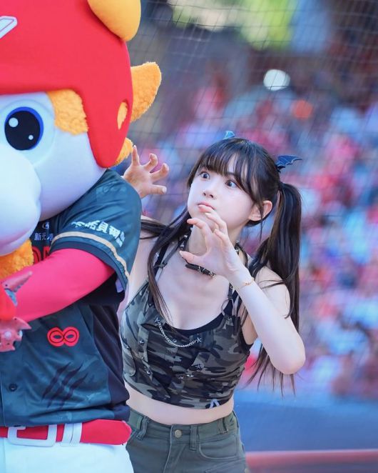이날 김나연은 군용 패턴의 크롭탑과 숏팬츠, 귀여운 박쥐 모양의 헤어핀을 매치해 눈길을 끌었다. 귀여운 비주얼을 완성한 김나연은 밝은 에너지로 응원을 펼쳤다.