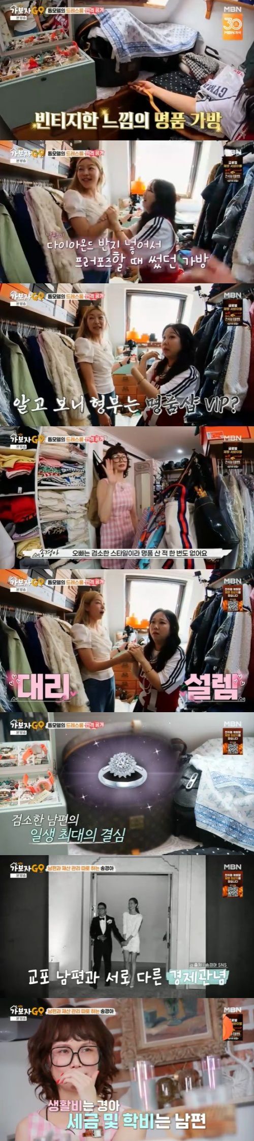 홍현희는 "난 이 가방을 갖고 싶다"고 했고, 송경아는 "남편이 다이아몬드 반지를 넣어서 프러포즈 했을 때 썼던 가방"이라며 "원래 모자 가방을 갖고 싶었는데 파는 곳이 없었다. 그때 남편이 여기 회사 가방에 전화했는데 홍콩에 하나 있다고 했다. 홍콩에서 사와서 여기에 다이아몬드 반지를 넣어서 프러포즈를 했다"고 밝혔다.