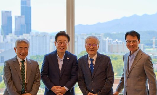 이재명 대통령이 11일 서울 용산 대통령실에서 정규재 전 한국경제 주필과 조갑제 전 월간조선 편집장과 오찬회동에 앞서 기념촬영을 하고 있다. 대통령실 제공 |