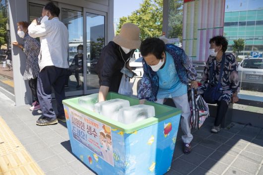 ▲전북 익산시가 폭염 대응 종합대책 일환으로 버스 승강장 28개소에 비치한 대형 얼음 및 생수를 통해 시민들이 더위를 식히고 있다. ⓒ익산시 |