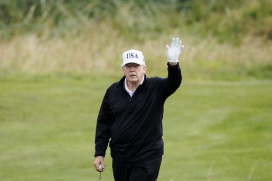 도널드 트럼프 미국 대통령이 26일(현지시간) 영국 스코틀랜드의 턴버리에서 골프 도중 손을 흔들고 있다. EPA 연합 |