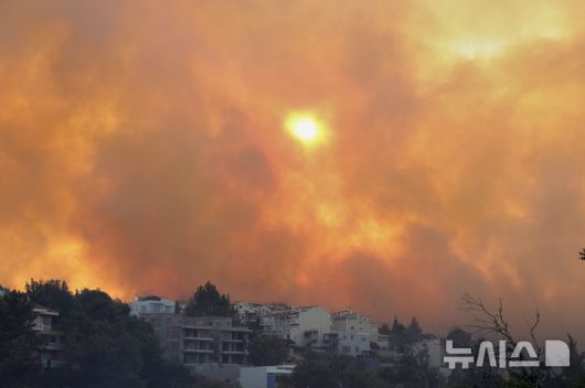 [아테네= AP/뉴시스] 그리스의 수도 아테네 북서부 교외인 크리요네리 지역에서 7월 26일 일어난 산불로 짙은 연기가 대낮에도 태양을 가리고 있다. 2025. 07.27. |
