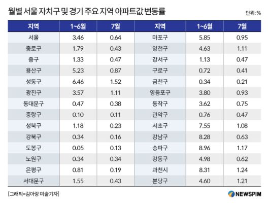 서울 아파트값은 서울시의 토지거래허가구역 해제 '이벤트'가 발생한 올해 1월 이후 6월 27일 이전까지 6개월간 3.46% 올랐다. 7월 한달간 아파트값 상승률은 0.64%다. 자치구별로 살펴보면 이 역시 빈익빈부익부가 고스란히 나타난다.