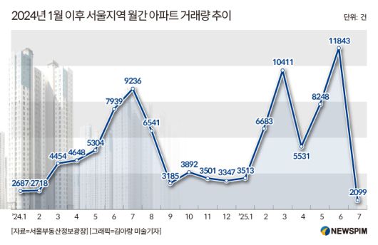 우선 6.27 가계부채 관리강화방안의 핵심 조치인 주택담보대출 제한으로 아파트 거래량이 대폭 줄었다. 지난 6월 한달간 서울 아파트 거래량은 1만1728가구였다. 반면 6.27대책이 본격 시행된 7월 1일부터 25일까지 서울 아파트는 한달 전보다 82% 줄어든 2099가구 거래됐다. 남은 다음주 4일을 포함하더라도 80% 이상 거래량 감소가 불가피할 것으로 보인다.