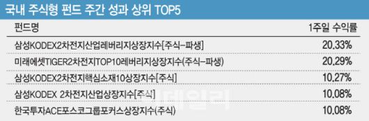 같은 기간 ‘미래에셋TIGER2차전지TOP10레버리지상장지수’의 수익률은 20.29%로 집계됐고 ‘삼성KODEX2차전지핵심소재10상장지수’는 10.27%, ‘삼성KODEX 2차전지산업상장지수’는 10.08%의 수익률을 각각 기록했다. 한 주간 성과 상위 4위권 모두 이차전지 관련 상품들이 이름을 올렸다.