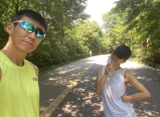공개된 사진에는 션과 그의 러닝 메이트 정혜영이 남산의 푸르른 숲길을 배경으로 인증샷을 남긴 모습이 담겼다. 흰색 민소매 티셔츠와 반바지, 러닝화를 갖춰 신은 정혜영은 물 한 병을 들고 환한 미소를 지어 보였다.