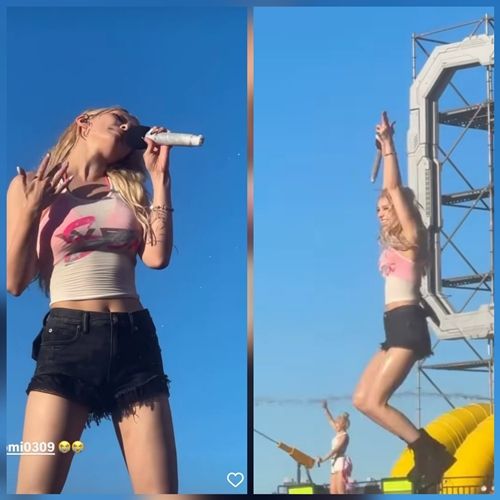 짧은 핑크 크롭톱과 블랙 데님 숏팬츠로 워터밤 특유의 물무대에 완벽하게 적응한 전소미는, 군살 없는 바디와 젖은 금발 웨이브 헤어로 무대 위 바비 인형 그 자체였다.