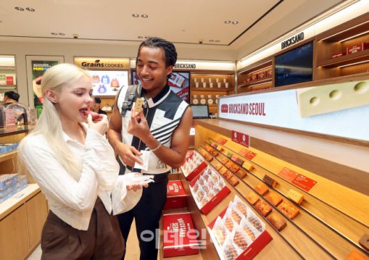 외국인들이 신세계면세점 명동점 식품존에서 브릭샌드를 체험하고 있다. (사진=신세계면세점) |